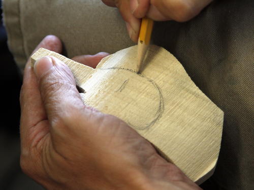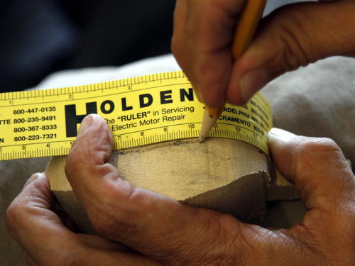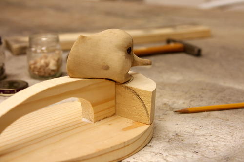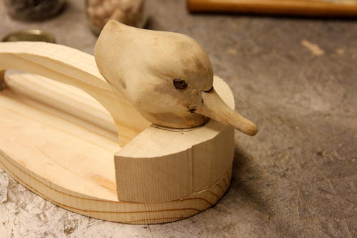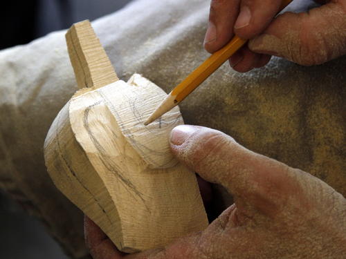 -             Place the finished head on the breast block and use a pencil to outline the neck joint on the block.