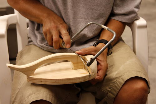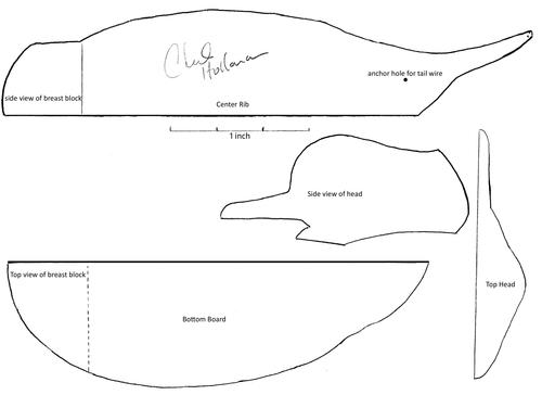 -             Cut out the head, breast block, bottom board, and center rib using a band saw. The head and breast block material is tupelo, and the center rib and bottom board material is pine shelving board.