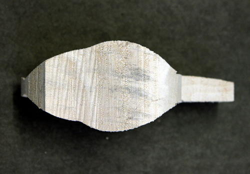 -             Take your saw or riffler and cut another groove in the very tip of the tail, running the full width of the center rib. Take another piece of wire and lay it into the groove you just cut and bend evenly on both sides to form your tail wire. Basically bend the wire into a heart shape for this pattern, leaving a ½-inch tag end on both sides that you will insert into the tail holes you drilled earlier. This top view shows the tail wire with the tag ends set into anchor holes in the center rib. Note how the back end of the tail wire fits into the groove you cut earlier.