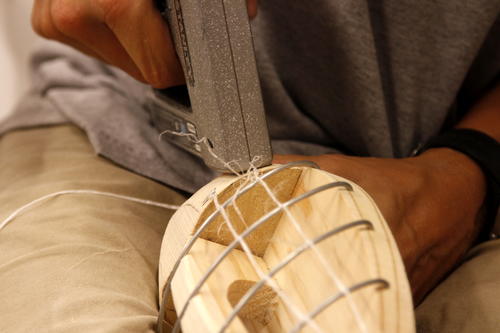 -             Use waxed cord to secure the tail wire to the last wire rib where they intersect. Tie a decent knot, and then work your way forward by wrapping a loop of cord around each wire rib, keeping the cord taunt. Secure the end of this cord to the edge of the breast block with a stainless staple from your staple gun. Pull the string back 180 degrees back towards the tail and staple back over the cord and trim the cord. Repeat on the other side. Secure the cord at the back of the bottom board behind the last wire rib again using the staple gun. Wrap the cord around all the wire ribs as you did before, working from the back to the front.