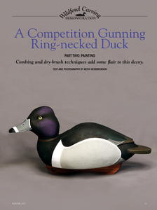 In the Fall 2016 issue, we saw how Patrick Bearden makes most of his gunning decoys when he demonstrated his carving of a swimming ring-neck drake. The article ended with Patrick filling the neck and body joints and doing a final sanding of the entire decoy. This part starts with Patrick priming the bird and then laying down a texture layer that will include vermiculated/combed side pockets. The final paint layers will include some neat drybrush work.