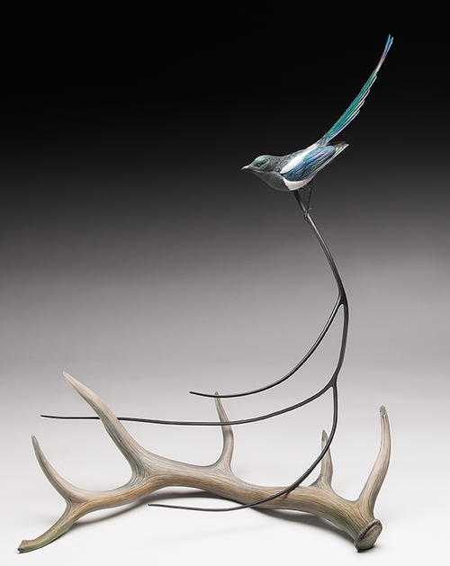 When this project began, I did not have a final vision of the completed sculpture, so I had to decide how to incorporate the magpie into some form of composition. Since the pose suggests a bird that has just landed, or is about to move forward, I had an idea that perhaps something had caught its keen eye and motivated it to descend through the branches to investigate. Magpies are common scavengers in many areas with elk, so it seemed a natural fit to have this bird checking out an antler it spotted.