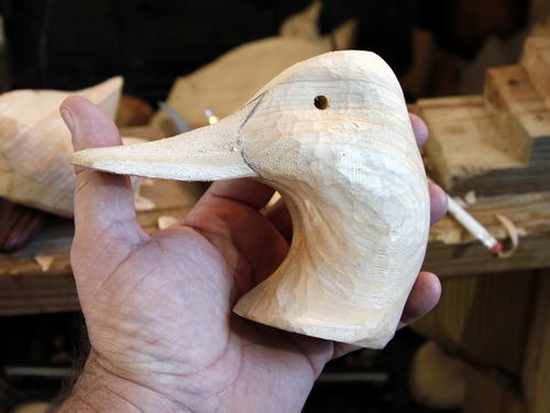 I discussed custom carving knives and some basic cuts in the Winter and Spring 2016 issues of Wildfowl Carving Magazine. For the following demonstration, I used knives for everything except the initial band saw work. I’ll use a good variety of blade styles and sizes so you can get an idea where different shapes can come into play. For this particular demonstration, I’ll carve a generic canvasback head. It will work for a decoy, as a coat/hat/gun rack or even cut in half and mounted on a plaque to hang on the wall. This demonstration doesn’t require precise or detailed bill carving, so it’s a great project for learning how to use and control a knife. I will demonstrate using white cedar. Here in the Carolinas we call it juniper. It carves great but definitely has a defined grain. That can be a bit of a deterrent, but carvers need to learn how to read that grain and deal with it. So let’s get to it: