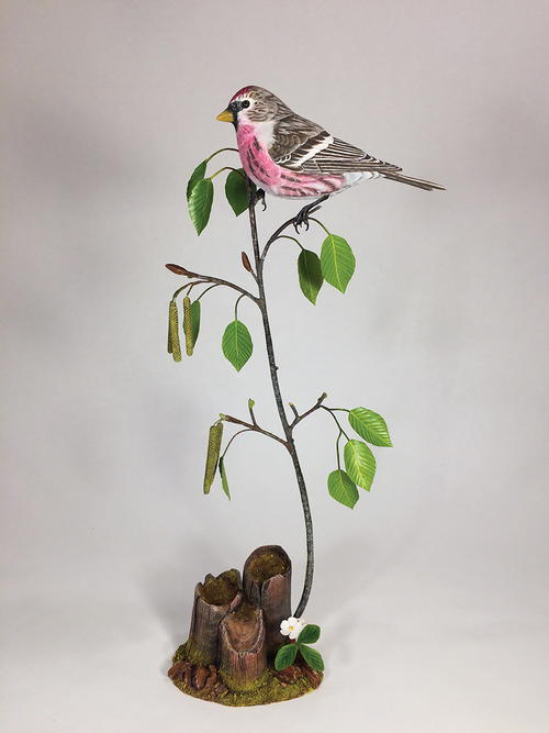 In the first part of this demonstration (Winter 2019), I completed the carving, texturing, and sealing of the common redpoll. I did not apply gesso as I still had to construct the feet and fit them to the bird and the branch. That involves a lot of handling and some of the gesso would rub off. With that step completed, I have now given the carving two coats of gesso and am ready to start painting. Painting the common redpoll involves a fairly limited palette. I will use a variety of browns (mainly burnt umber); grayish white on the underparts; red or pink on the crown, breast, flanks, and rump; black for the bib, forehead, and feet; and yellow for the bill. The color swatches show the colors I used with approximate mixes. I recommend experimenting with the mixes before applying them to the carving.
