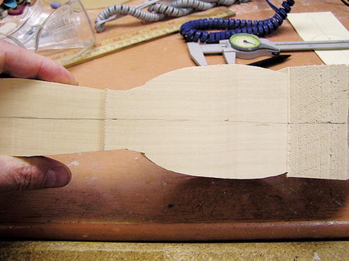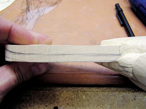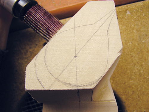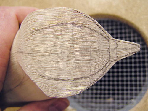 Find a block of tupelo that will fit both the profile and top view patterns. You want the wood grain running in the direction of the tail and head. This will add strength to the primaries, tail, and beak. Cut the profile view on a band saw. Square up the head on the block so you can turn it without losing the proper plane. Draw the body centerline down the front and back of the cutout block. -
