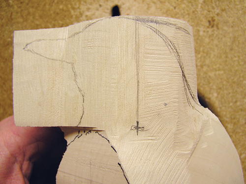 With the top view of the head drawn on the block, cut straight down from the top view to the lower edge of the head. Refer to the profile pattern. It is important to make these cuts straight rather than beveled in or out from the base of the head. -