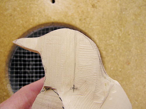 Begin cutting to the reference lines for the beak and throat. Starting with the top view, cut from the side straight into the line representing the outer edge of the beak. Don’t be afraid to cut into the line, otherwise the beak will be too wide or thick. Once the top view is complete, do the same thing for the profile to assure proper size and shape. Follow the same approach for the throat feather group as seen here. -