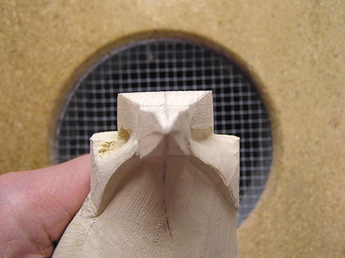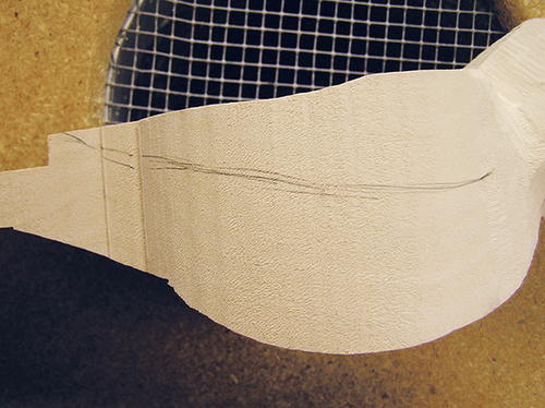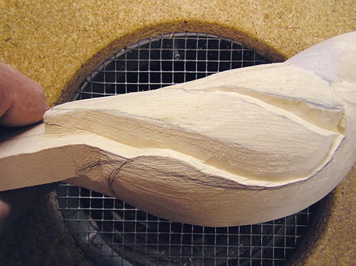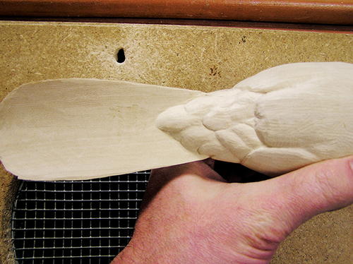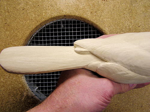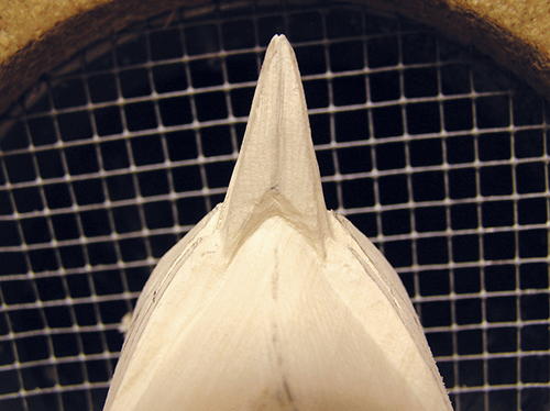 Rough in the tail by cutting up into the centerline on the underside to get an arched appearance. Notice how there is a slight uplift at the end of the tail. Taper the top slightly to the outside edge. Be sure to leave about 1⁄8 of an inch extra thickness on the outside of the tail for layering in the feathers during later steps.