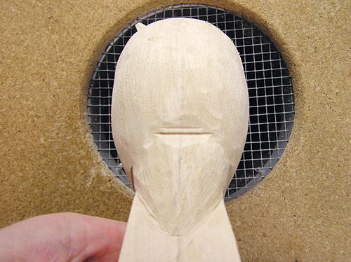 I use Elmer’s Wood Filler around the eyes. Use a paintbrush to remove excess filler until you get the look and attitude you want. Try to open the tips of the almond shape to around 7 mm wide. -