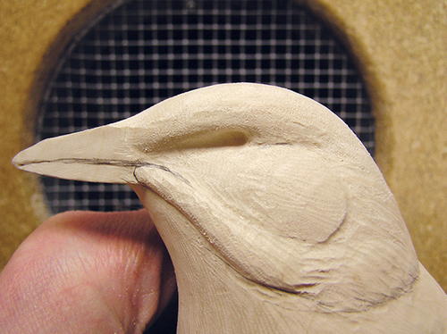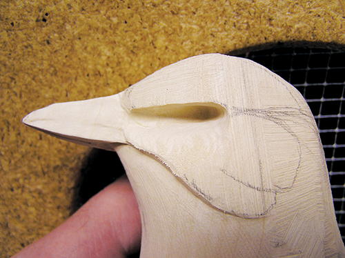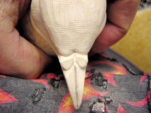 It becomes easier to give the upper and lower mandibles their proper shapes once you’ve established the proper widths. Round the upper mandible to the centerline, with the lower edge having a slight roll under (into the crease). The lower mandible has more of a flat bottom but still has a lower edge that rolls into the crease. Now create the inset appearance of the throat feathers as they