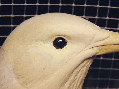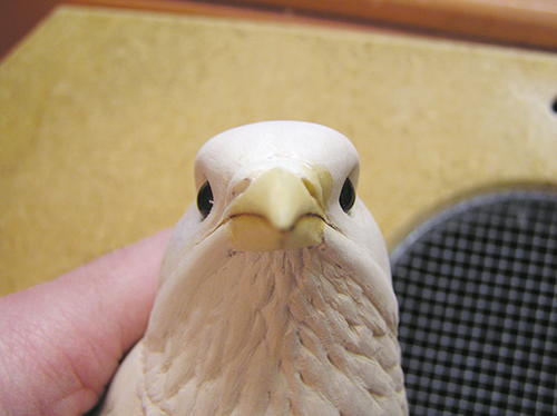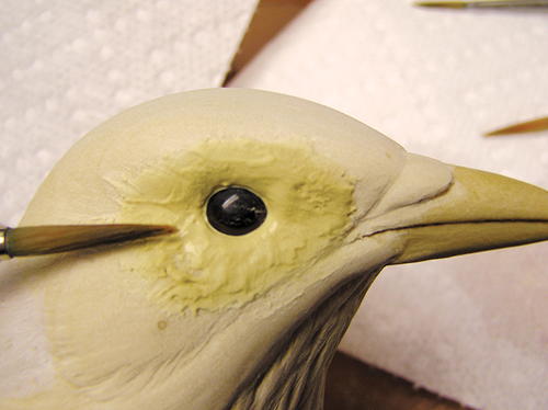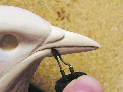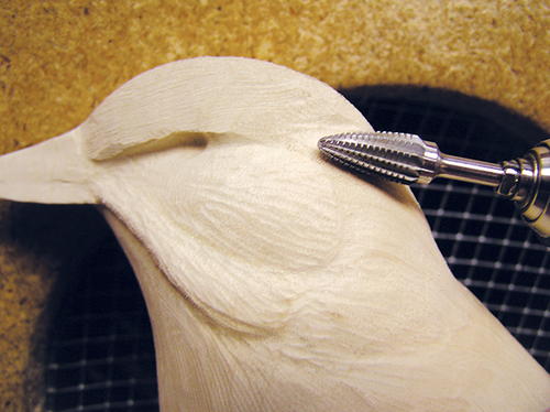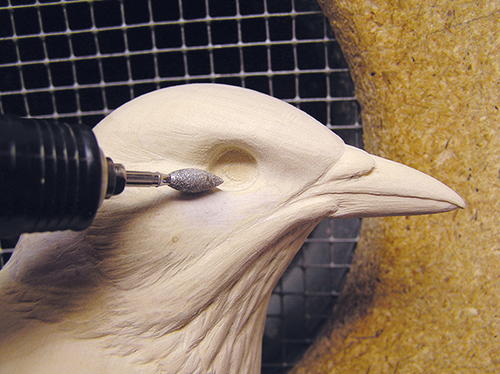 Verify the proper placement for the eyes, assuring balance from left to right and up and down. Draw a 7 mm circle for a guide before you cut the eye socket. With a carbide cylinder, cut straight into the head with a slight forward angle. Verify the eye will set down inside the cut without exposing the lower outer edge of the eye. Once you’ve established the depth, eliminate the harsh edges by rolling out of the eye socket into the feathers around the face. Sand the head smooth to prepare for setting the eye. -