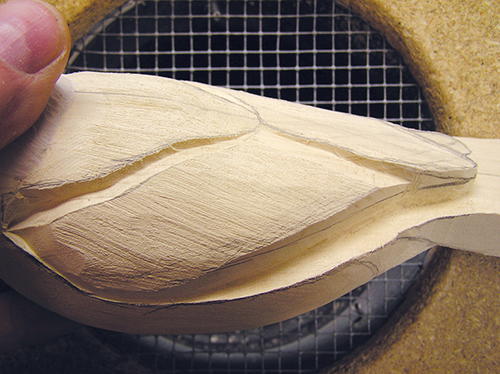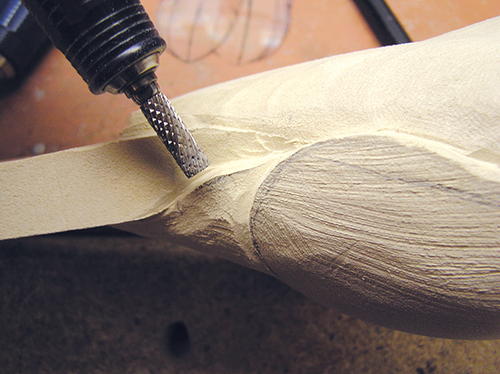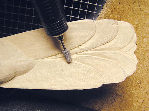 The vent feathers are loose and fluffy. One way to create this effect is to make a number of random steps from one feather to the next. Use a cylinder bit to create loose, random, and deep cutting steps across this area. -