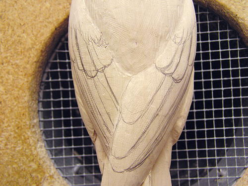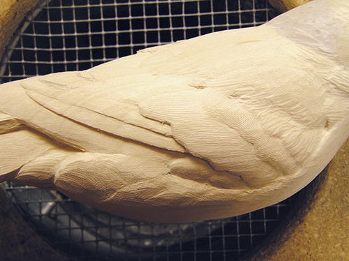 With the wings cut into place, smooth and round each wing. The wing should have a smooth flow from the top of the primaries all the way to the wrist. If you see lumps or bumps in this area, smooth them out. Smooth and round the soft feathers that flow up to the wing or over the wing at this time. Smooth and round the edges of the cape so it appears as though the cape feathers flow on top of the wing. -