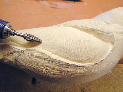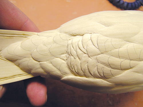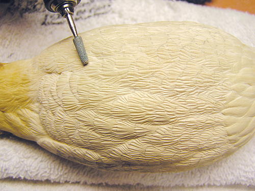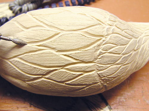 On the breast, belly, under-tail coverts, and cape, create flow lines that radiate out to the tail from the centerline. Use S curves and arcs to randomly connect one flow line to another so it all appears graceful. Once you are pleased with the look and flow of these groups, cut them in with the diamond flame. Be sure to vary the depths of your cuts. You will typically have shallow cuts in the breast but deeper ones around the centerline and as you move to the back portion of the belly and flanks. Next, roll off the edges on both sides of each cut to represent a smooth transition, as shown here. -