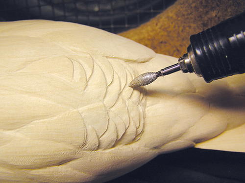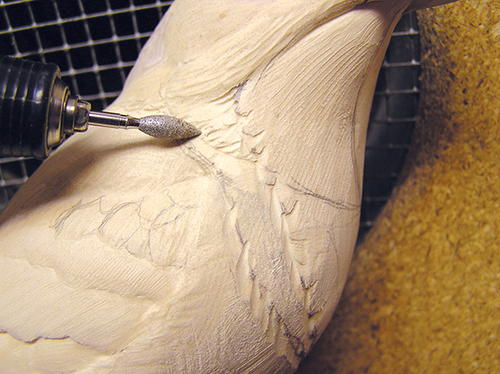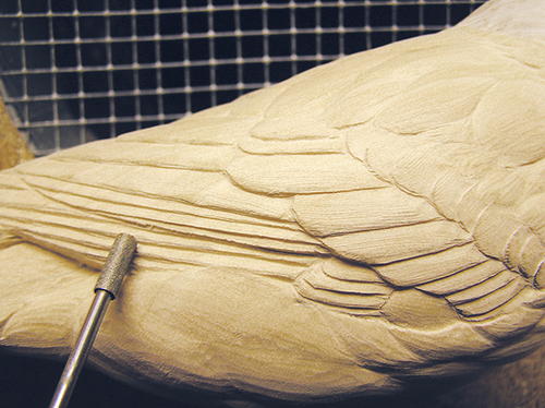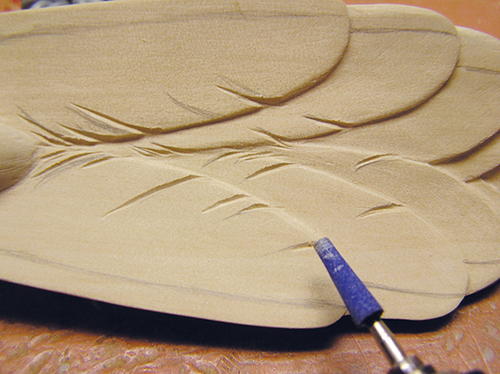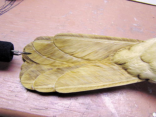 Draw and cut the individual wing and tail group feathers with a safe end diamond cylinder. Make sure not to create a uniform layout. Mix things up by making some feathers more exposed and some less. -