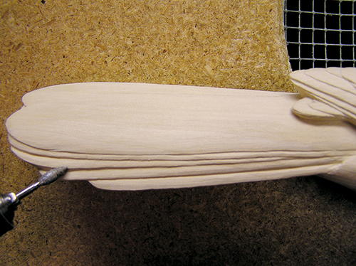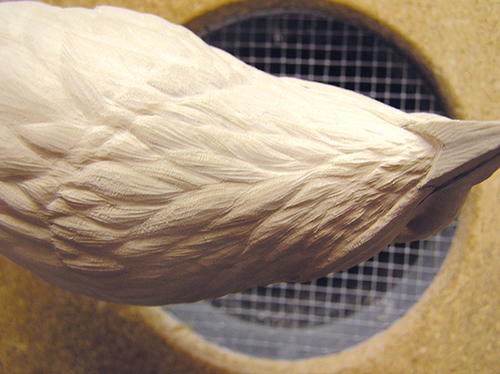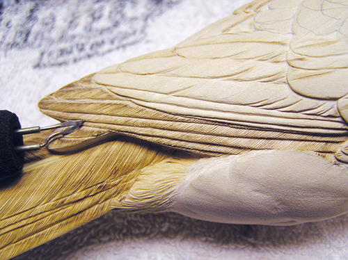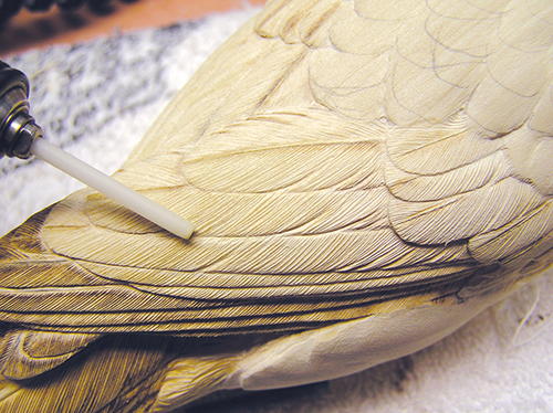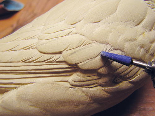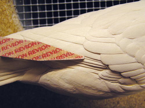 Round the edges of these individual wing feathers so they appear to stack softly onto the feathers below. Where you want separation, don’t round the edge all the way down to the lower feather. Clean the feathering with sandpaper or an emery board. -