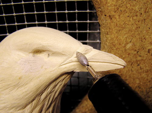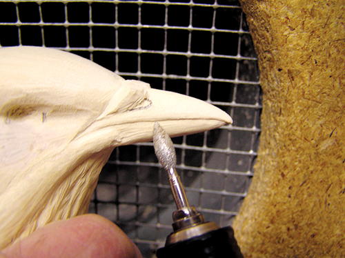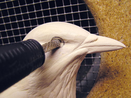 There are three or four layers of feathers known as the lores in front of the eye. Draw in their arcs and then cut them in using a safe end diamond cylinder. Make sure to vary the spacing of these arcs. Texture the nostril bristles as well. The nostril whiskers are stiff bristles so you will need to burn these in to create the stiff look. -