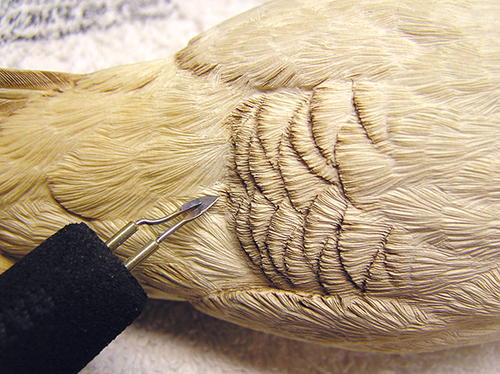 The primary and tail feathers are hard feathers and are the only ones I burn. Burn each line as fine and tight as possible. Shallow is better than deep. -