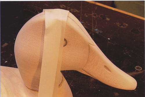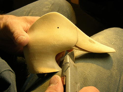 I am temporarily attaching the head to the body using a hot-glue gun. When I am satisfied with the transition of the head to the body and the decoy’s overall appearance, I will twist off the head to start hollowing.