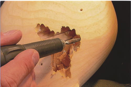 Using a Kutzall bit, I create a taper on the inside edge of the hole. This will help make the fix invisible.