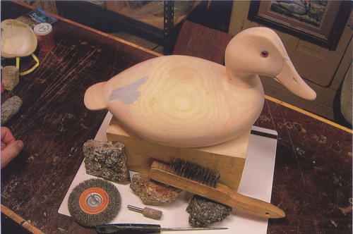 I go over the entire decoy with a piece of defuzzing material or steel wool to remove some of the fuzz I created during the distressing process.