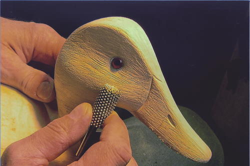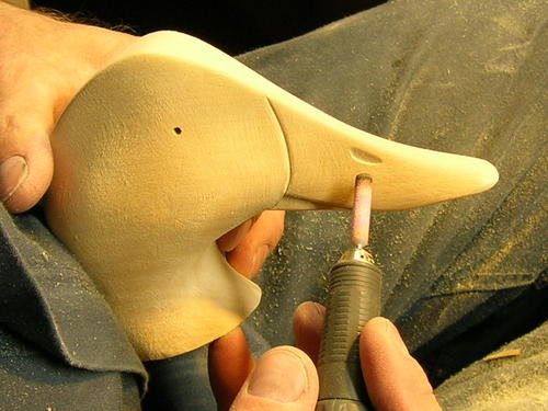 I use a cylinder-type stone to define where the bill meets the head. Then, using the same stone, I quickly add the indication of a nostril.