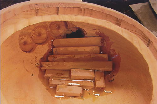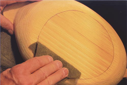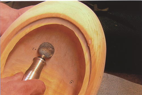 I am using a 1 1/8" Kutzall ball to smooth the inside of the hollowed area. You can see the reference holes I drilled in from the top. As soon as I reach a hole, I pencil around it so I don’t break through.