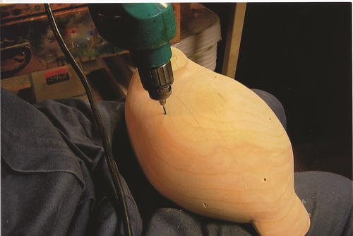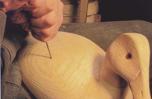 With a very small drill bit sticking out of the chuck about a half inch, I drill several holes into the duck. These will eventually become destination points I will want to meet with my various bits when I hollow.