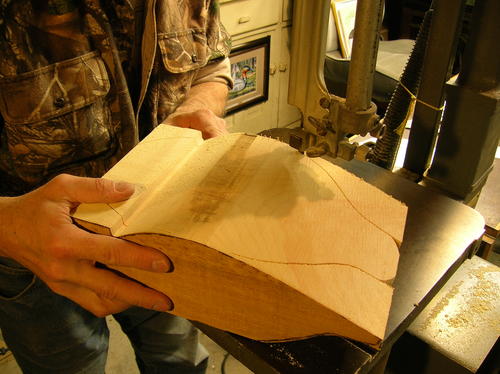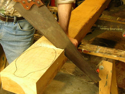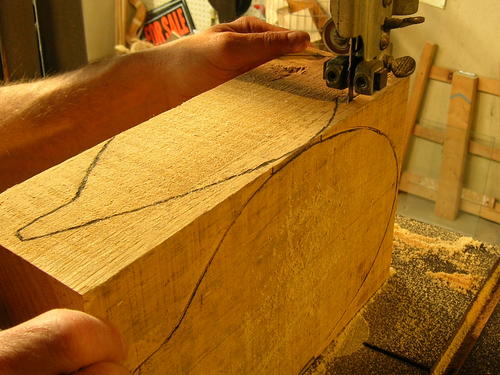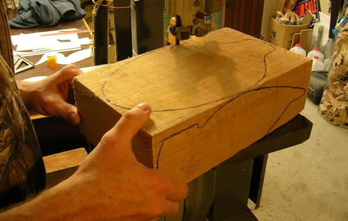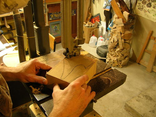I cut out the top view, letting a little piece of 4 from the block. wood remain on both sides so I could flip the block on its side for the next step.