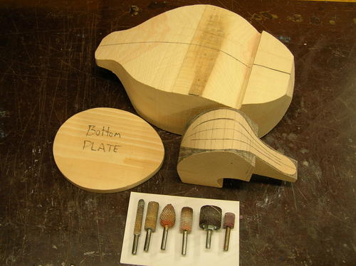 Since I will hollow the decoy, I cut a plate to use when the hollowing is complete. I also sketch in a top view on the head and bill to help guide me through the carving. I will use these Kutzall and Saburr Tooth bits in my Foredom grinder to do most of the carving.
