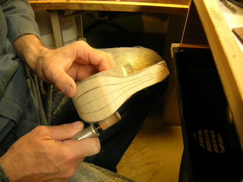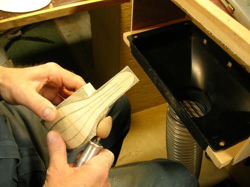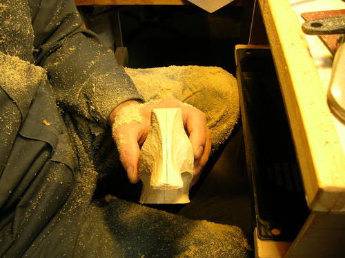I like to strop the head to its final shape. You can really move wood this way. Trap the sandpaper with your left thumb and pull it through with your right hand. Once you mastered this technique, you will love how quickly the sanding goes.