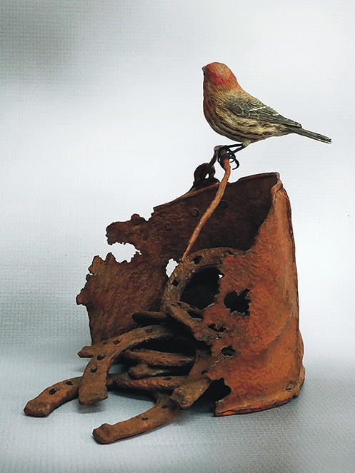 In an earlier article (“Altered Landscapes,” Summer 2018) I mentioned how birds make functional use out of manmade, rusty junk for their daily activities. I enjoy the dynamic between the soft organized structure of the birds’ feathers and the rough and unpredictable surface that rust presents. An additional attraction is that the colors in rust can complement just about anything.