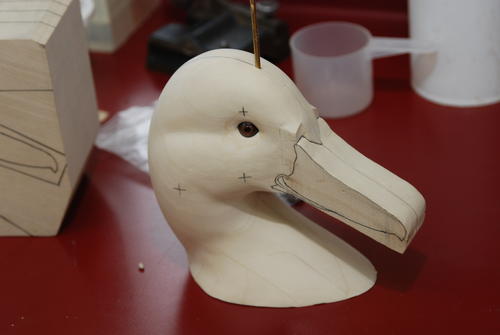Before he carves the head, Rick drills a hole through the head block and fits it with a dowel the same diameter as the eye. Then he cuts and sands the dowel section to the proper length and mounts the eyes to the ends of the dowel. Rick feels this ensures the proper distance between the eyes and symmetrical angles for each eye.