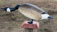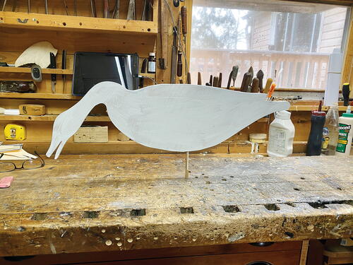 There are five typical poses for goose decoys: feeding, hissing, snuggling (head to chest), sleeping/preening, and sentinel. George decided to carve this goose in a feeding pose. He took the flat plywood model and painted in white Rustoleum to get a better idea of how the pose would look.