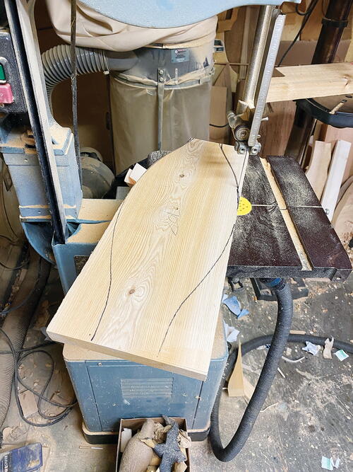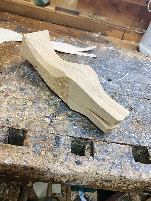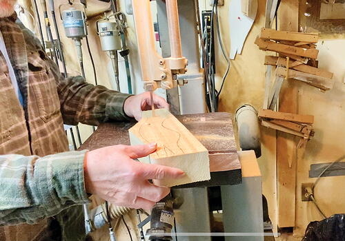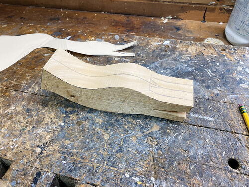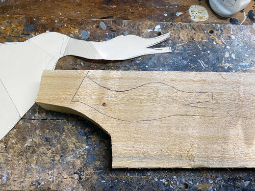Taking the pattern for the head, George traces in onto a piece of 2" white cedar. He has aligned the grain horizontally, because doing it vertically could cause the head to snap off along the grain. Once the head has been traced, it is now ready to be cut out on the band saw.