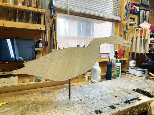 George will construct the goose’s body from three pieces of wood. Here, after tracing the pattern, he cuts out the middle section from a piece of 1/4" cedar.