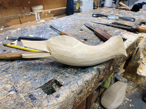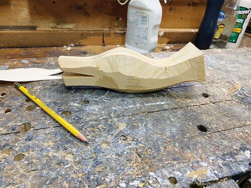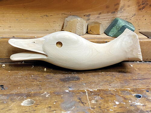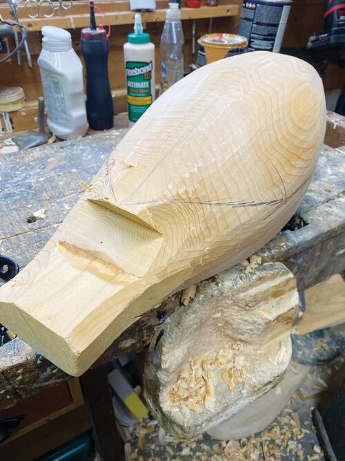 In this shot of the rough-cut head, you can see the initial cheek and bill shaping.