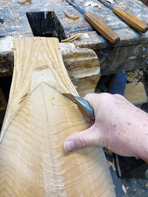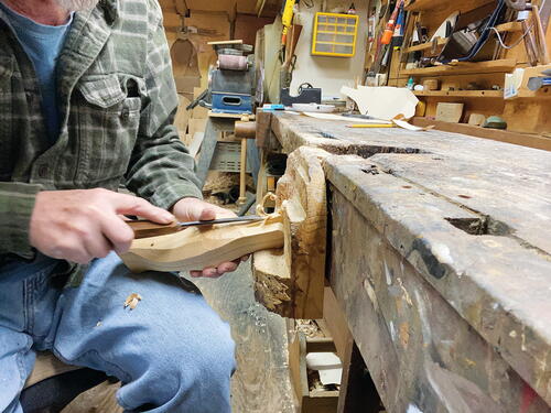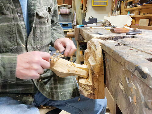 George uses a bench stop as an anchor while he continues to carve the head, now with a gouge.