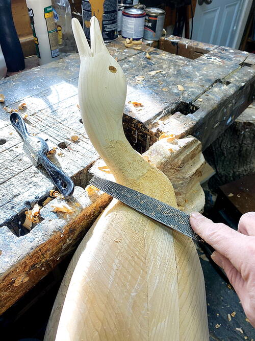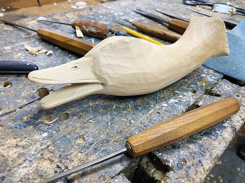 To carve the nostrils and do bill detailing, George uses a small gouge.