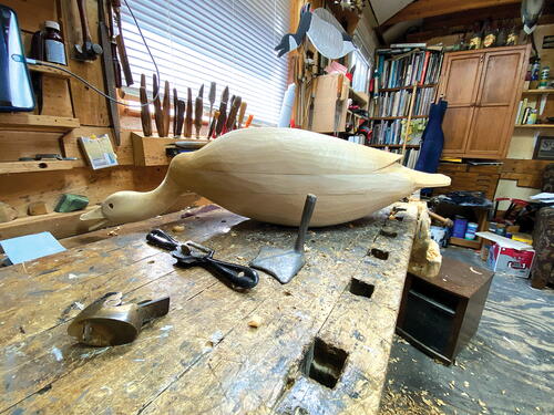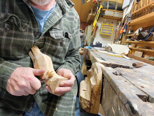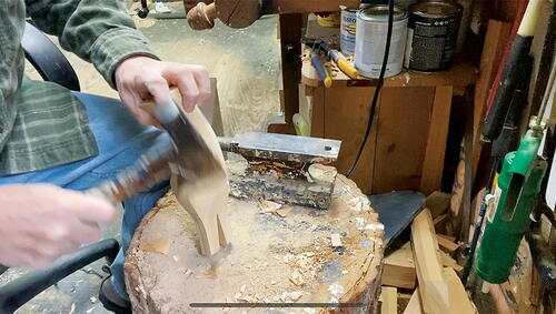 George takes a hatchet and uses short strokes to rough shape the goose’s head.
