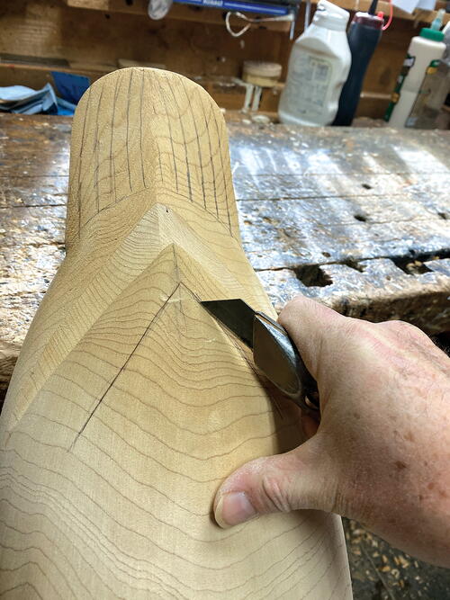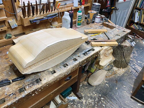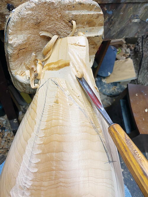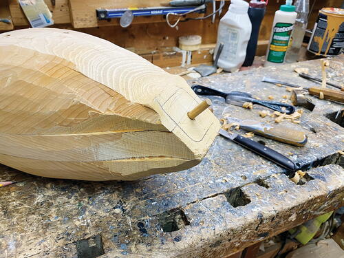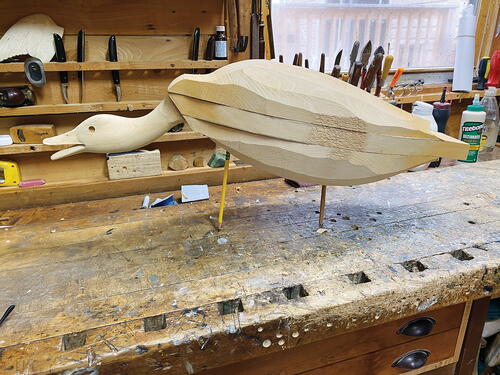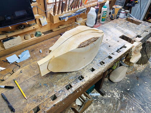 The head will be mounted on a dowel and secured with finishing nails. The body still needs further tapering so it will transition smoothly into the head.