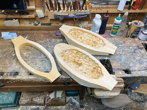 The top and bottom boards are cut from 3" cedar. This is what the three pieces look like coming from the bandsaw. George needs to hollow out the body before permanently assembling it. He temporarily attaches the pieces with screws going up from the bottom. Hot wax would also work.