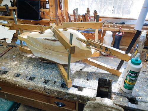 Using Titebond III, George glues the body pieces together and secures them with clamps. He allows a day for the glue to set.