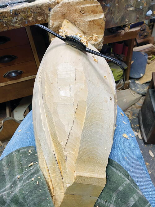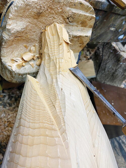 Now using a flat gouge, George continues to undercut and define the sides of the tail.