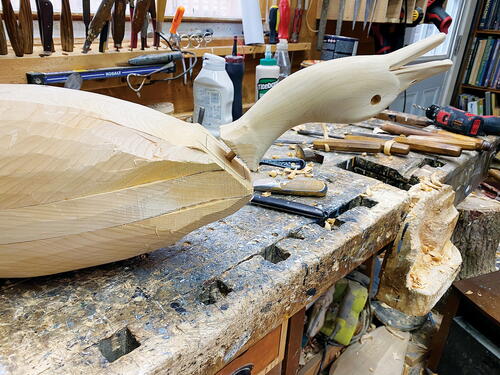 Using a gouge, George carves out the tail and undercuts the primaries, using the bench stop as his carving base.