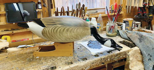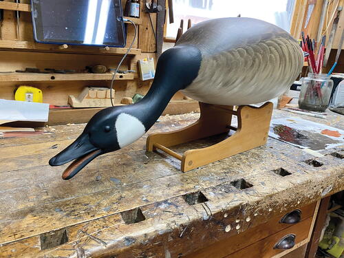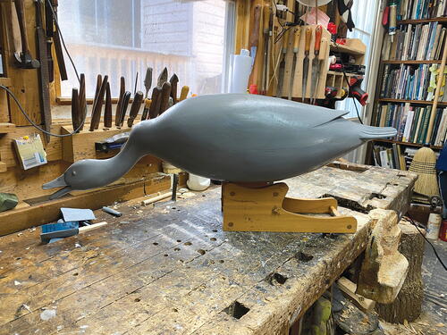 George Strunk of Glendora, New Jersey, is one of the top carvers working today. His working decoys are superb, and his miniatures are as good as anyone’s, and that includes the great Elmer Crowell. A while ago, George’s friend, carver and master restorer Russ Allen, gave him several iron goose feet. George used the first two feet to make standing ice geese, which he sold. He very graciously agreed to use the final foot to make a feeding ice goose for this demonstration.