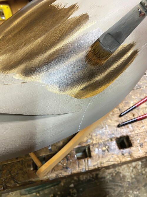 He paints the side pockets with a mixture of raw sienna and white over raw umber, which he then blends with a soft graining brush or a fan brush.