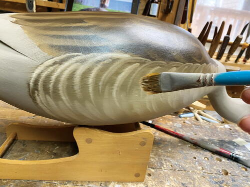 He adds the black and white areas on the goose’s head and tail. He warms the black on the head a little by using a small amount of raw umber.