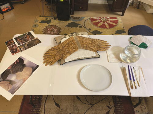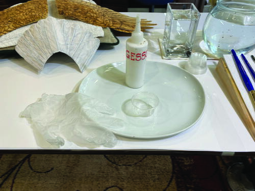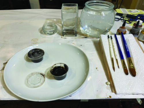 I use a soft plastic squeeze bottle for my gesso. My painting palette is a large, oval dinner plate, and I use 2 oz. plastic cups for mixing my paints. When you use acrylic paints, you must avoid touching the carving. Disposable latex gloves are very handy.