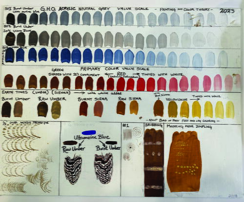 Prior to beginning and committing color to the carving, I create a test board. For this, you can either apply white gesso to a piece of sanded plywood or purchase a pre-gessoed panel at your local art store. This board enables me to work out my color mixes and techniques before I begin the painting process. I think of it as a sort of “warm up” that can help eliminate any guesswork as the work progresses.